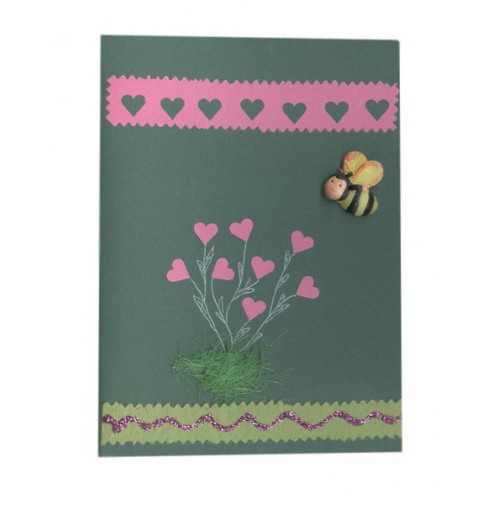 Material: zelen karton, bleščice, lesena osa, izsekani srčki, pisalo v gelu, zelena umetna travica, ročno izdelan papir.