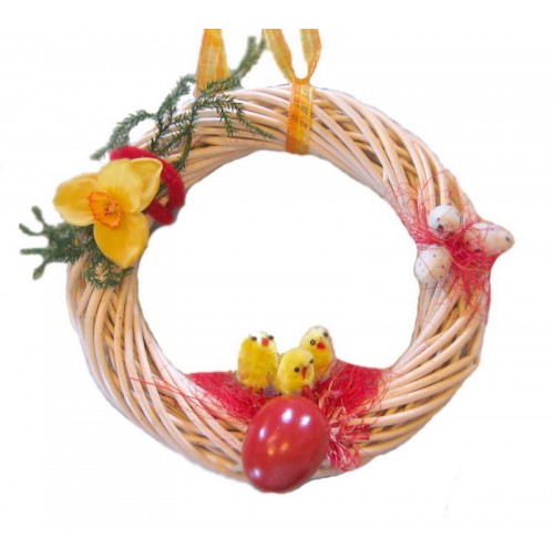 Material: pleten venček, ozek rumen trak, zeleno umetno zelenje, umetno rumen cvet narcise, rumeni piščančki, rdeči laski, rdeče plastično jajce, 3 mini plastična jajčka.