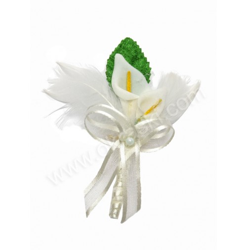Novost so broške na katere lahko natisnete slikico, inicialki, imeni, datum ali kombinacijo omenjenih možnosti.Material: umetna cveta kale, listek, trak, perlica, perje, sponka
