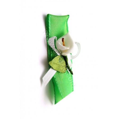 Novost so broške na katere lahko natisnete slikico, inicialki, imeni, datum ali kombinacijo omenjenih možnosti.Material: širok zelen trak, umetni cvet kale z listm, satenast trak, sponka