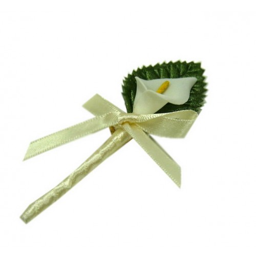 Novost so broške na katere lahko natisnete slikico, inicialki, imeni, datum ali kombinacijo omenjenih možnosti.Material: umetni cvet kale, umetni zelen list, satenast trak, dekorativna žička, sponka