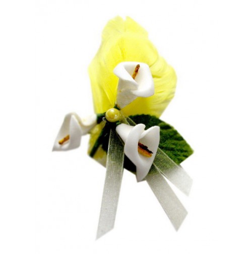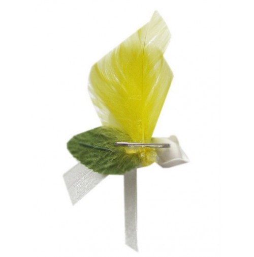 Novost so broške na katere lahko natisnete slikico, inicialki, imeni, datum ali kombinacijo omenjenih možnosti.Material: perje, bele umetne kale, rumena perlica, trak, umetni list, dekorativna žička, sponka