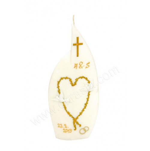 Material: bela sveča, okrasna bela golobčka, svetlikajoč lak, vosek okrasni trakovi, zlata prstana