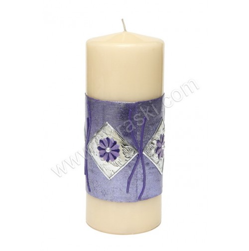 Material: belž sveča, ročno izdelane rožice, svetlikajoč lak, vosek okrasni trakovi, bleščice
