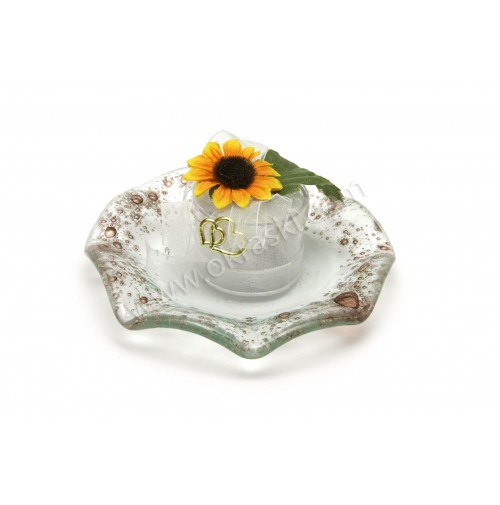 Material: steklen ročno izdelan krožnik z mehurčki - fi 12 cm, trak, bel til ovit v mandel, prozorna PVC posodica z mandlom, svileni cvet -sončnice, dekorativna srčka.