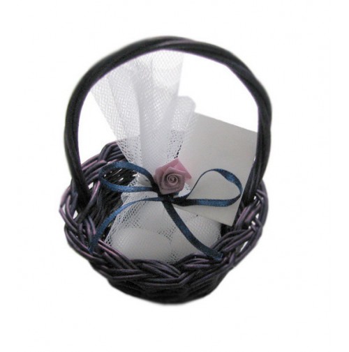 Material: moder svileni trak, modra košarica v kateri je1 mandelj, lila umetna vrtnica, bel til.