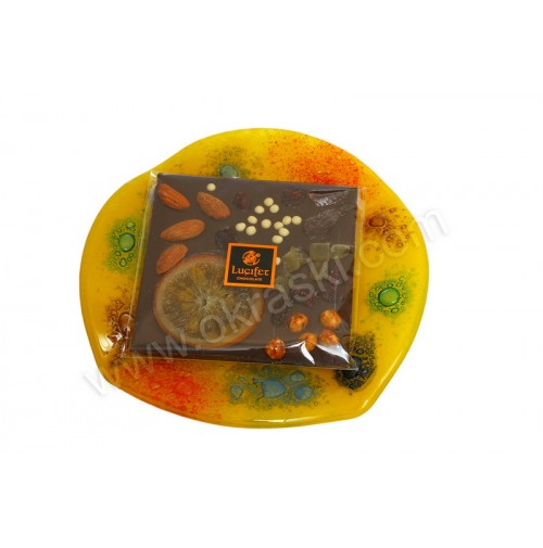 - temna čokoladna tablica - posuta (Lucifer) v celofan vrečki;Material: 4 mm debelo rumeno steklo s postopkom fuzije, čokoladica,