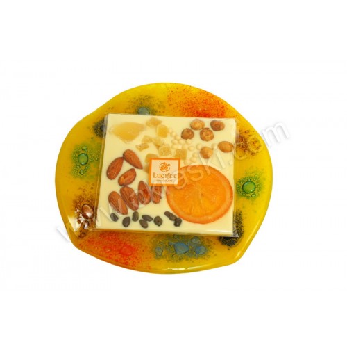 - bela čokoladna tablica - posuta (Lucifer) v celofan vrečki;Material: 4 mm debelo rumeno steklo s postopkom fuzije, čokoladica,