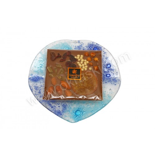 - mlečna čokoladna tablica - posuta (Lucifer) v celofan vrečki;Material: 4 mm debelo modro steklo s postopkom fuzije, čokoladica,