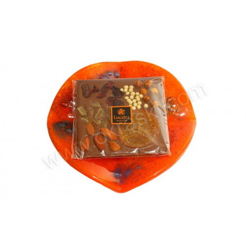 - mlečna čokoladna tablica - posuta (Lucifer) v celofan vrečki;Material: 4 mm debelo oranžno steklo s postopkom fuzije, čokoladica,