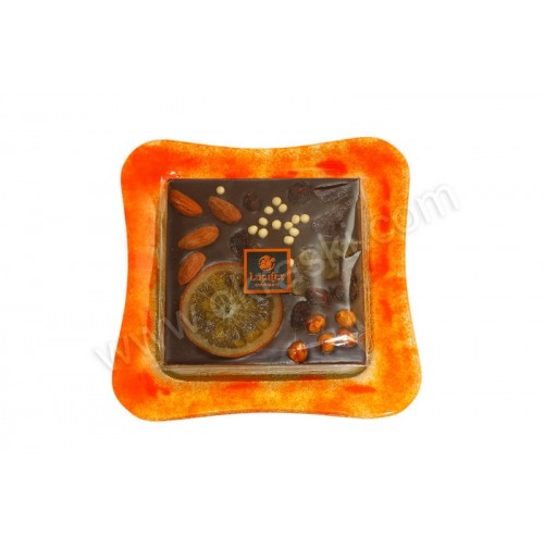 - temna čokoladna tablica - posuta (Lucifer) v celofan vrečki;Material: 4 mm debelo oranžno steklo s postopkom fuzije, čokoladica,
