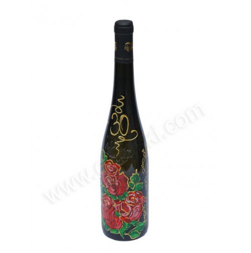Ročno poslikana steklenica z vrtnico. Lahko se doda napis. Poslikano z obstojno barvo, katera se lahko opere pod tekočo vodo, brez dodanega detergenta.UNIKATNA