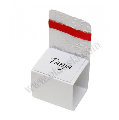 - upoštevajte sam prostor in postavitev miz.Material: bel svetlikajoč karton z inbosingom, rdeč svilen trak