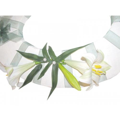 Material: stiropor, bela barva, kale z listki, zeleni trak, bele perle.