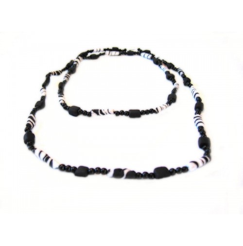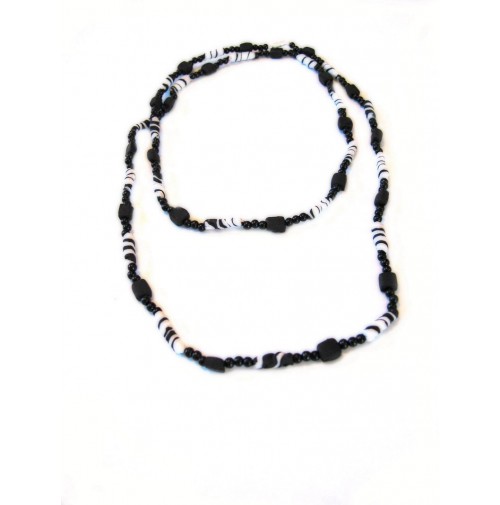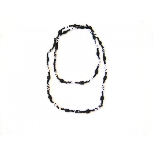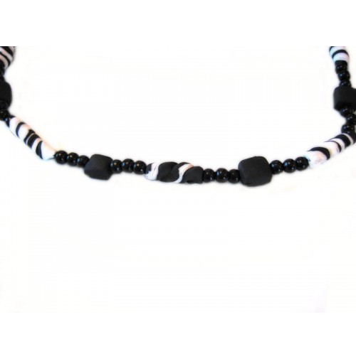 Material: črne perlice, silk, srebrna obročka za verižico, fibo masa, fibo lak.